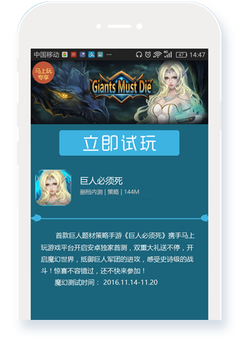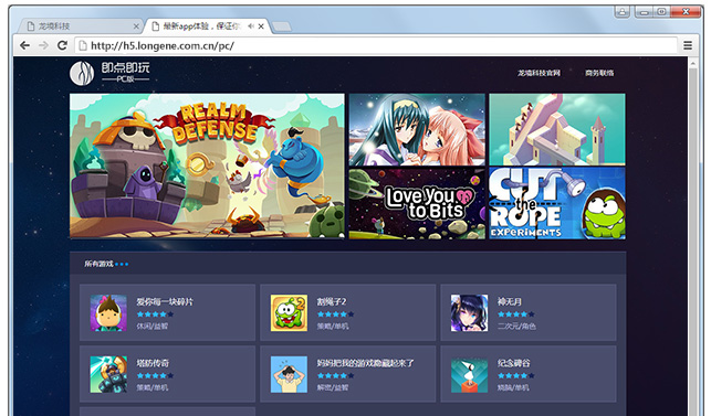 為便于游戲開發商、社交應用平臺創新廣告形式、提升應用下載率,龍境科技通過將瀏覽器和云應用流結合,實現任意手游APP加載到網頁中運行,利用Web節省游戲玩家進入游戲的時間和流量成本,方便快速演示、體驗APP,現已支持微博、微信、今日頭條等社交及新聞應用內置瀏覽器。